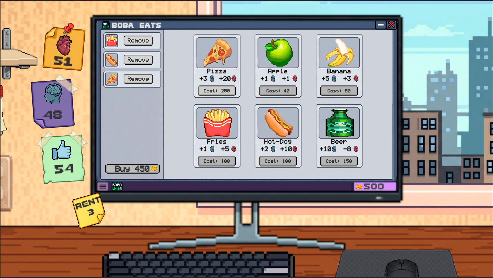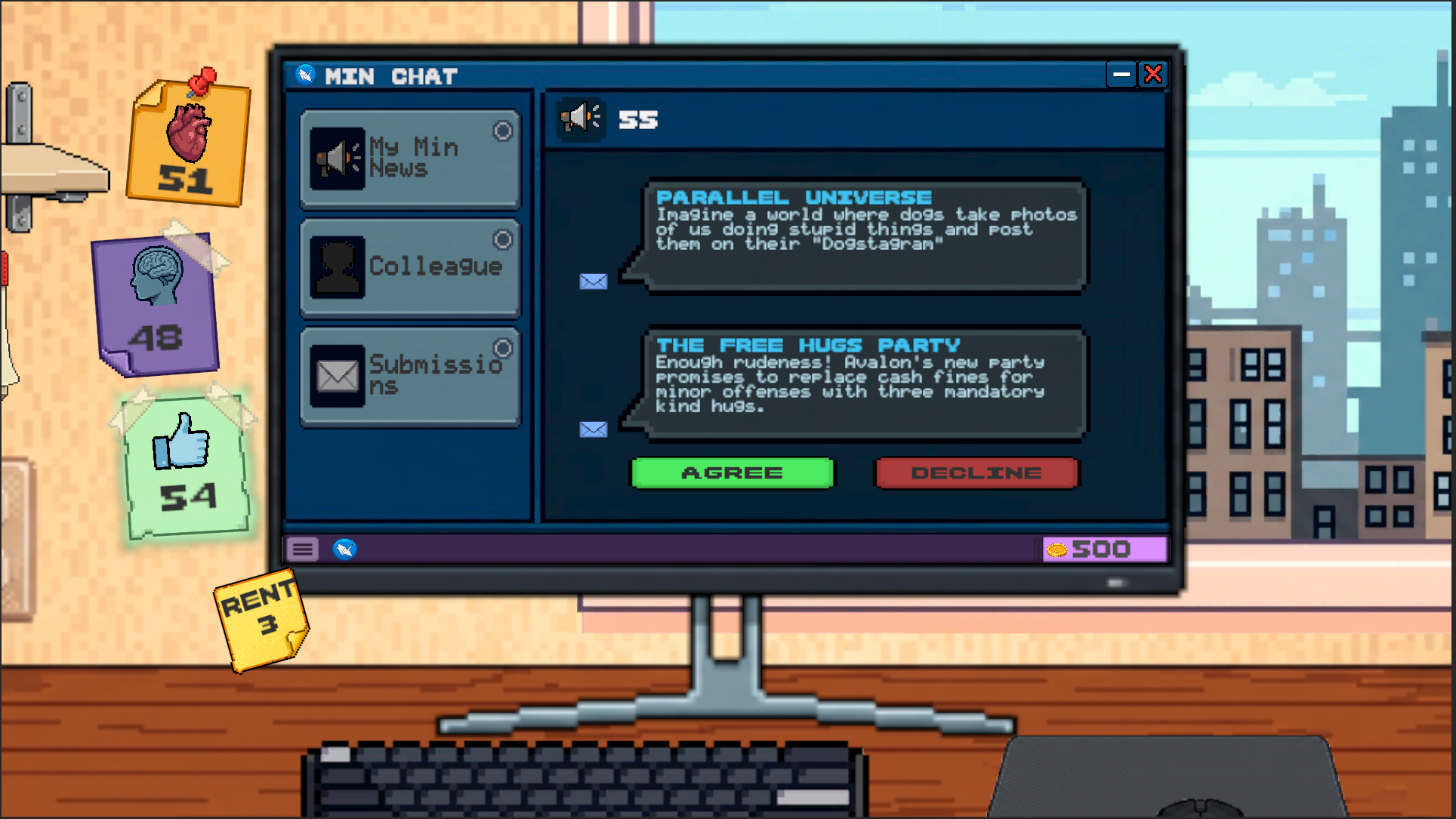 A work-from-home survival simulator where your monitor is your job, your window to the world, and your grave. You moderate an endless chat, clean up comments, and earn pennies to pay your rent every three days. Fail to collect enough money — instant eviction follows.