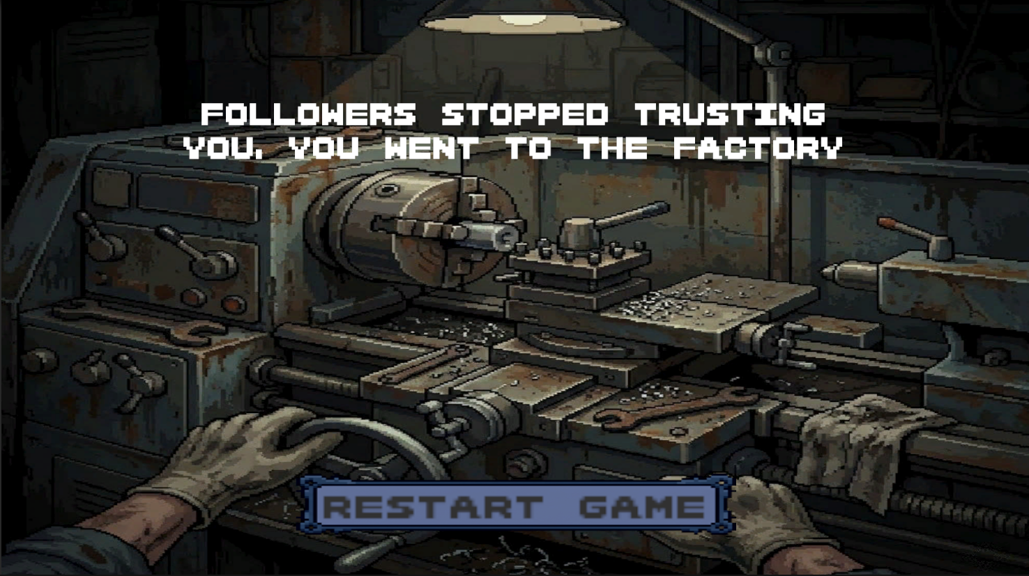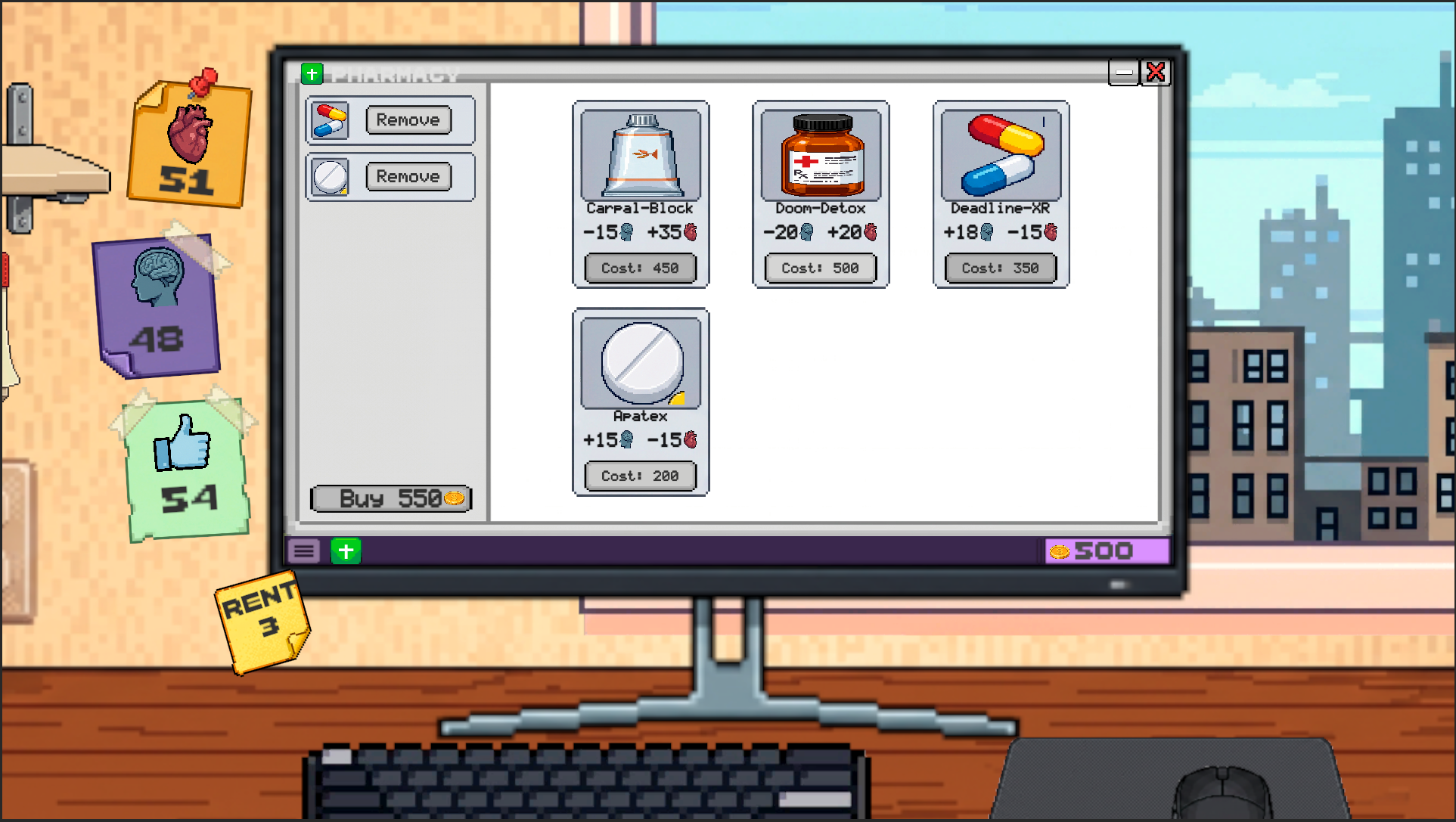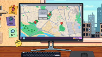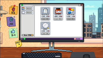 Your life depends on three stats: physical health, mental health, and audience approval. You must constantly balance them in a narrow corridor from 0 to 100. Drop to zero — you die from exhaustion or the crowd destroys you. Exceed a hundred — it's also game over: overdose, fanatical obsession, or a heart attack. Buy drugs with severe side effects, order fast food, or kill working time by taking walks on the map in an effort to stabilize your stats.